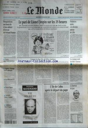 MONDE (LE) [No 16486] du 28/01/1998 - PERQUISITIONS AU DOMICILE ET AU CABINET D'AVOCAT DE ROLAND DUMAS - LE PARI DE LIONEL JOSPIN SUR LES 35 HEURES - POLLUTION - ALERTE A LA DIOXINE AUTOUR DE LILLE - FUSION DANS L'INFORMATIQUE - ALGERIE - L'EUROPE VEUT LE DIALOGUE - LA COLERE DES IUT - PROCES PAPON - FOOTBALL - FRANCE-ESPAGNE - AMBIANCE TOUR D'ARGENT - L'ANNEE DU TIGRE FETE DES FELINS FANTOMES PAR PHILIPPE PONS - LE ROMAN NOIR DE BILL CLINTON - L'ILE DE CUBA APRES LE DEPART DU PAPE PAR JE PDF pdf Free Download by .... Find the best books from ... on Lesebook.com, 100% free download... MONDE (LE) [No 16486] du 28/01/1998 - PERQUISITIONS AU DOMICILE ET AU CABINET D'AVOCAT DE ROLAND DUMAS - LE PARI DE LIONEL JOSPIN SUR LES 35 HEURES - POLLUTION - ALERTE A LA DIOXINE AUTOUR DE LILLE - FUSION DANS L'INFORMATIQUE - ALGERIE - L'EUROPE VEUT LE DIALOGUE - LA COLERE DES IUT - PROCES PAPON - FOOTBALL - FRANCE-ESPAGNE - AMBIANCE TOUR D'ARGENT - L'ANNEE DU TIGRE FETE DES FELINS FANTOMES PAR PHILIPPE PONS - LE ROMAN NOIR DE BILL CLINTON - L'ILE DE CUBA APRES LE DEPART DU PAPE PAR JE pdf Free Download ...
